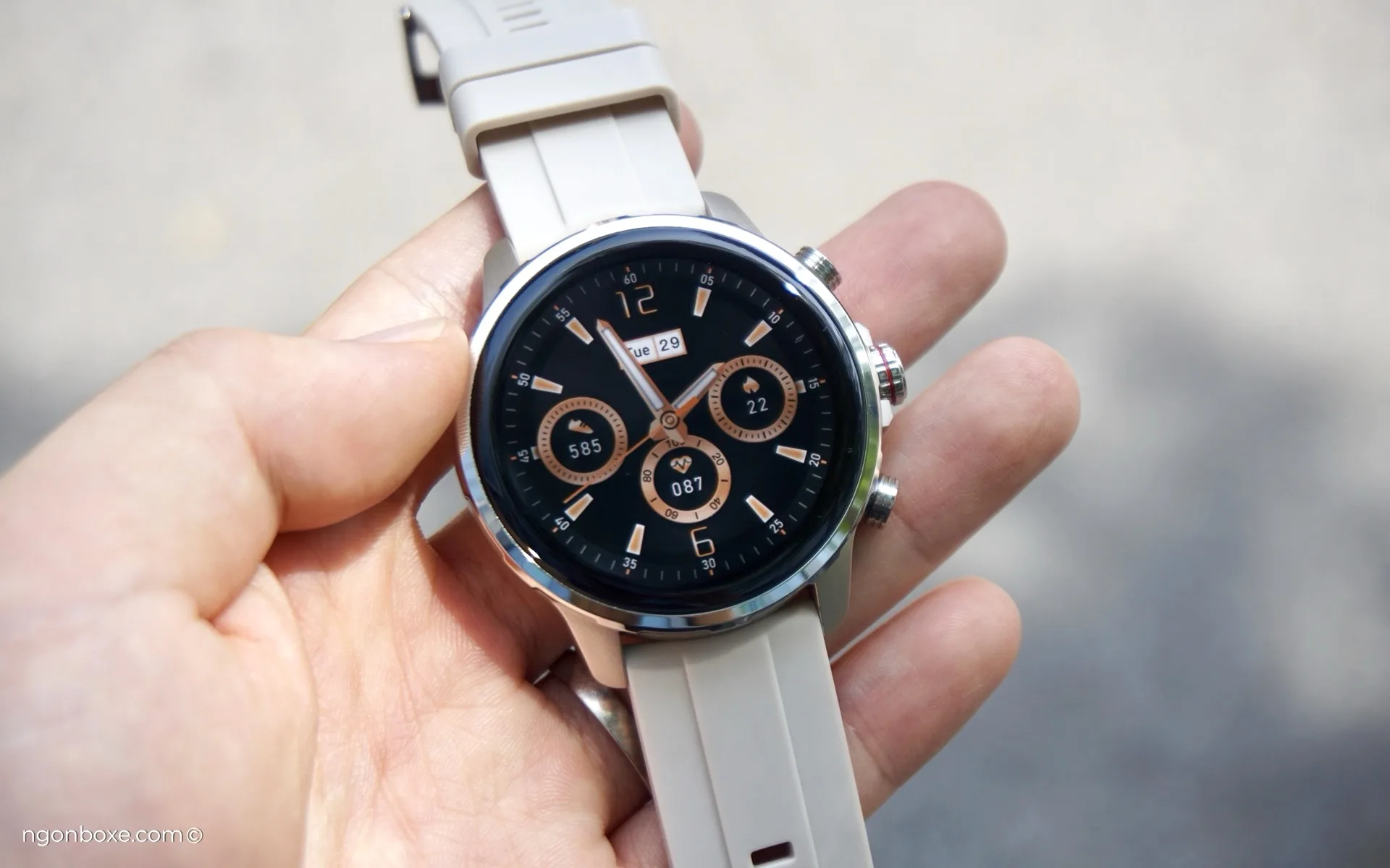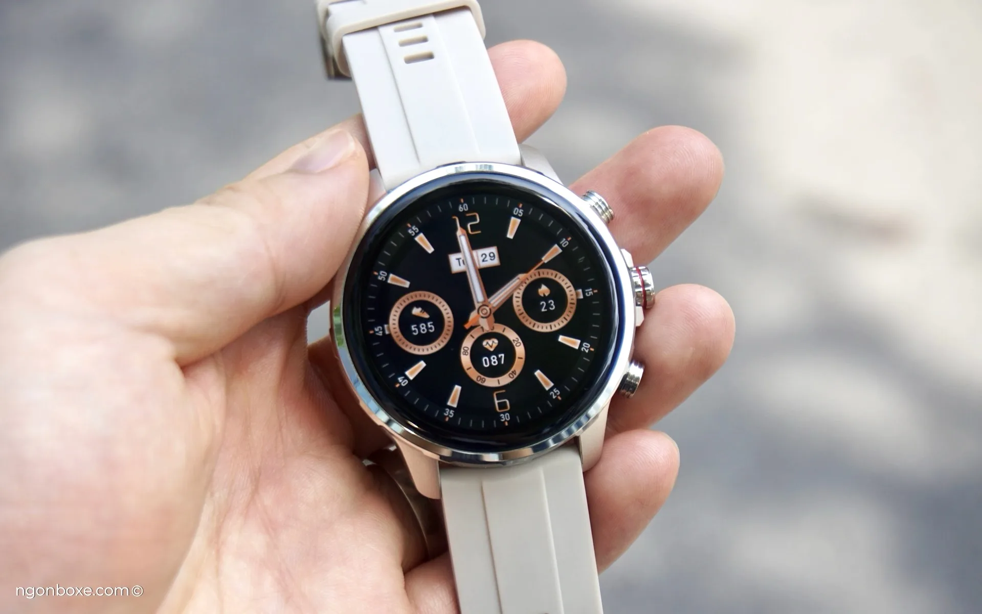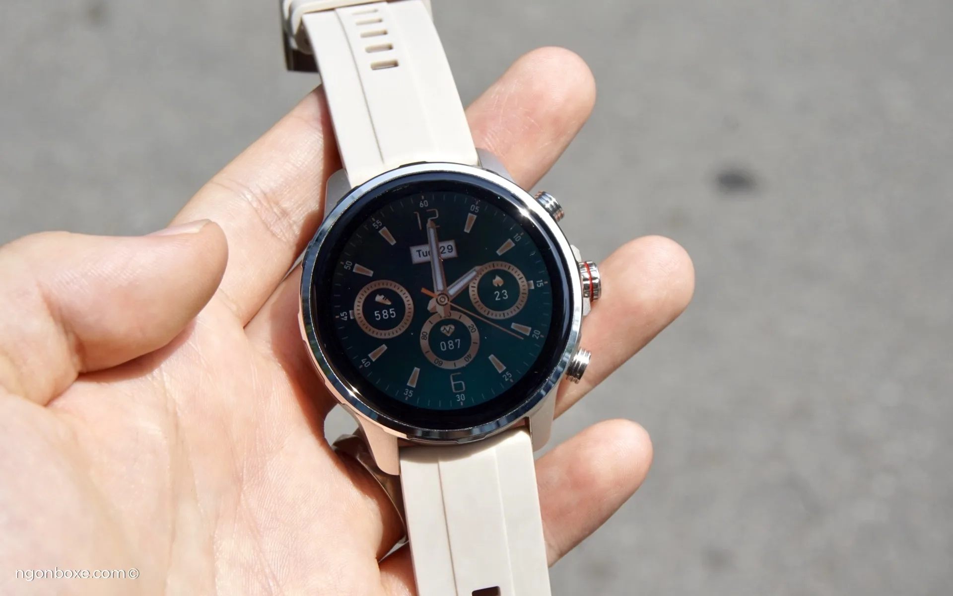 Khi để những mặt đồng hồ màu sáng, phần viền đen của màn hình sẽ lộ rõ hơn, dày khoảng 3mm, thêm 2mm của phần vỏ bên ngoài nữa, phần màn hình bên trong có đường kính khoảng 36mm, tức là chỉ tương ứng với khoảng 1.42 inch.