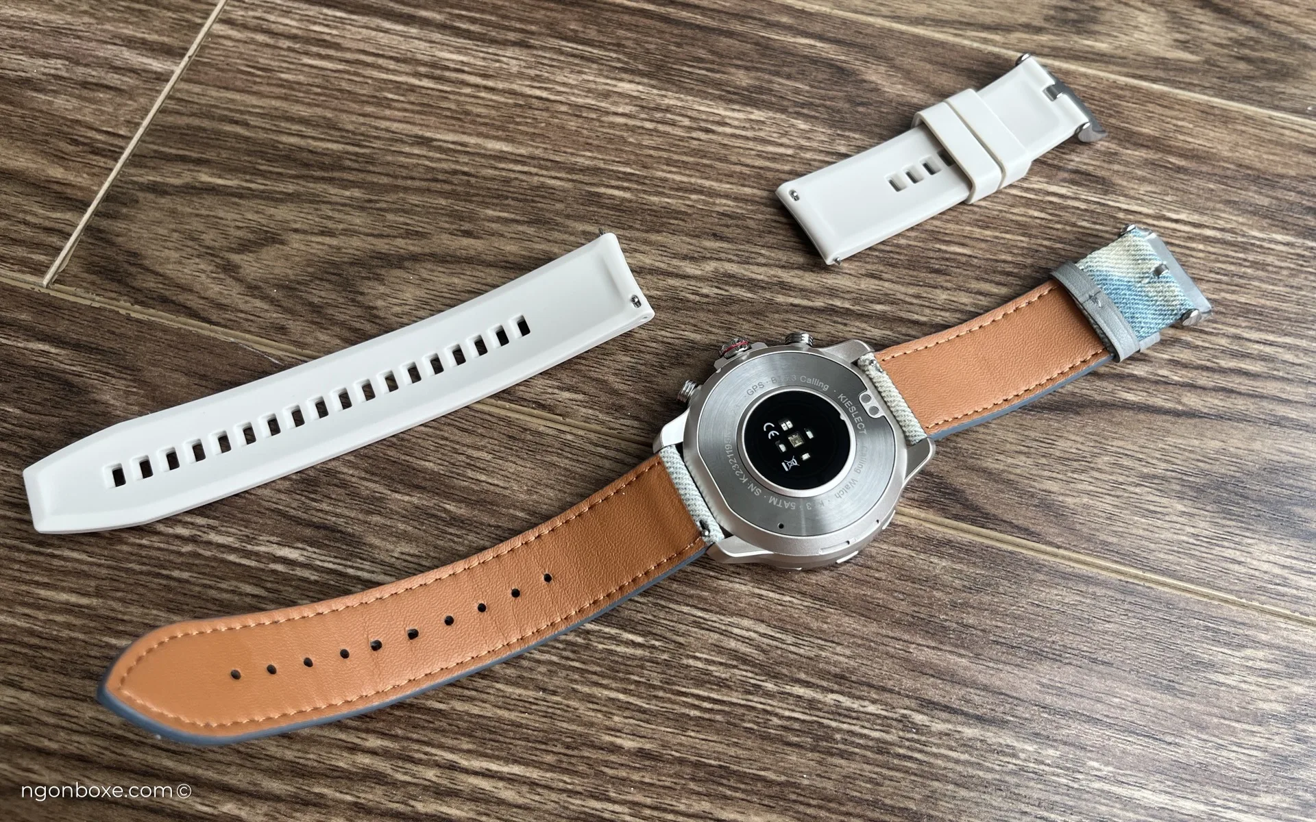 Đi kèm với Kieslect KR3 sẽ có sẵn miếng dán bảo vệ màn hình và 2 sợi dây đeo, một sợi bằng silicon cơ bản và một sợi denim phong cách phai màu, bụi bặm.