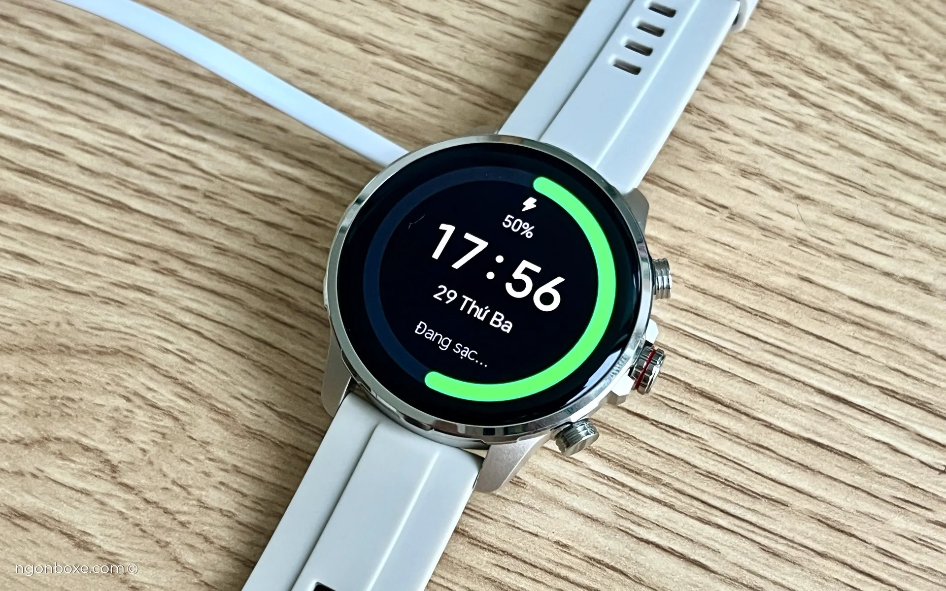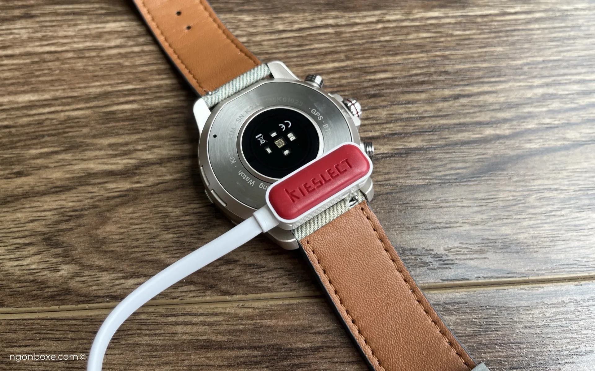 Dây sạc của Kieslect được hít nam châm vào mặt đáy của đồng hồ, cấu hình cơ bản của những chiếc đồng hồ thông minh trong mức giá này. Cáp sạc cũng được làm chỉn chu với logo của hãng được dập chìm trên vỏ cáp.