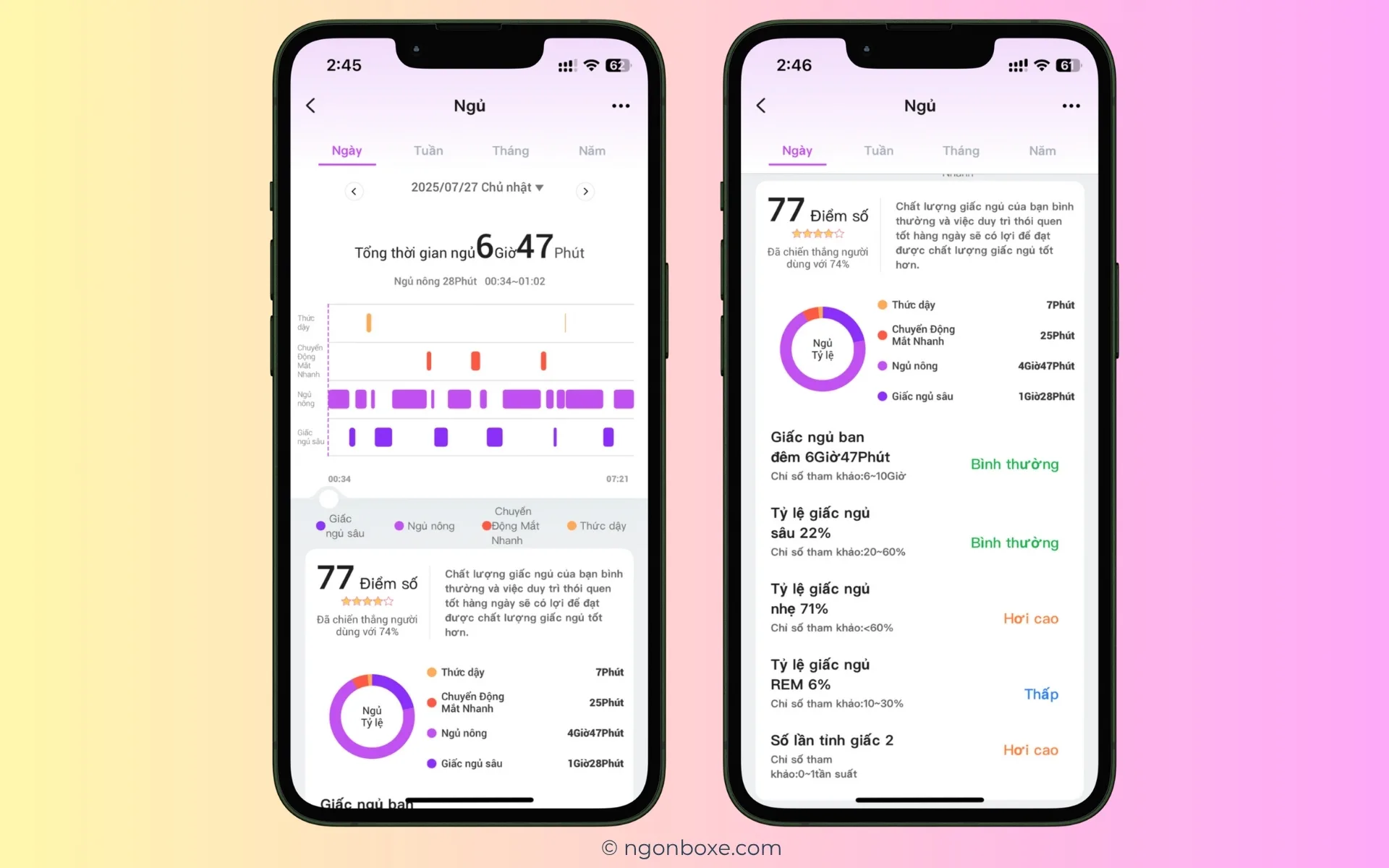 Tính năng theo dõi giấc ngủ cũng hoạt động khá tốt, có theo dõi các giấc ngủ nông, ngủ sâu, ngủ REM và đưa ra đánh giá về chất lượng giấc ngủ để chúng ta có thể điều chỉnh để đạt được giấc ngủ tốt hơn.