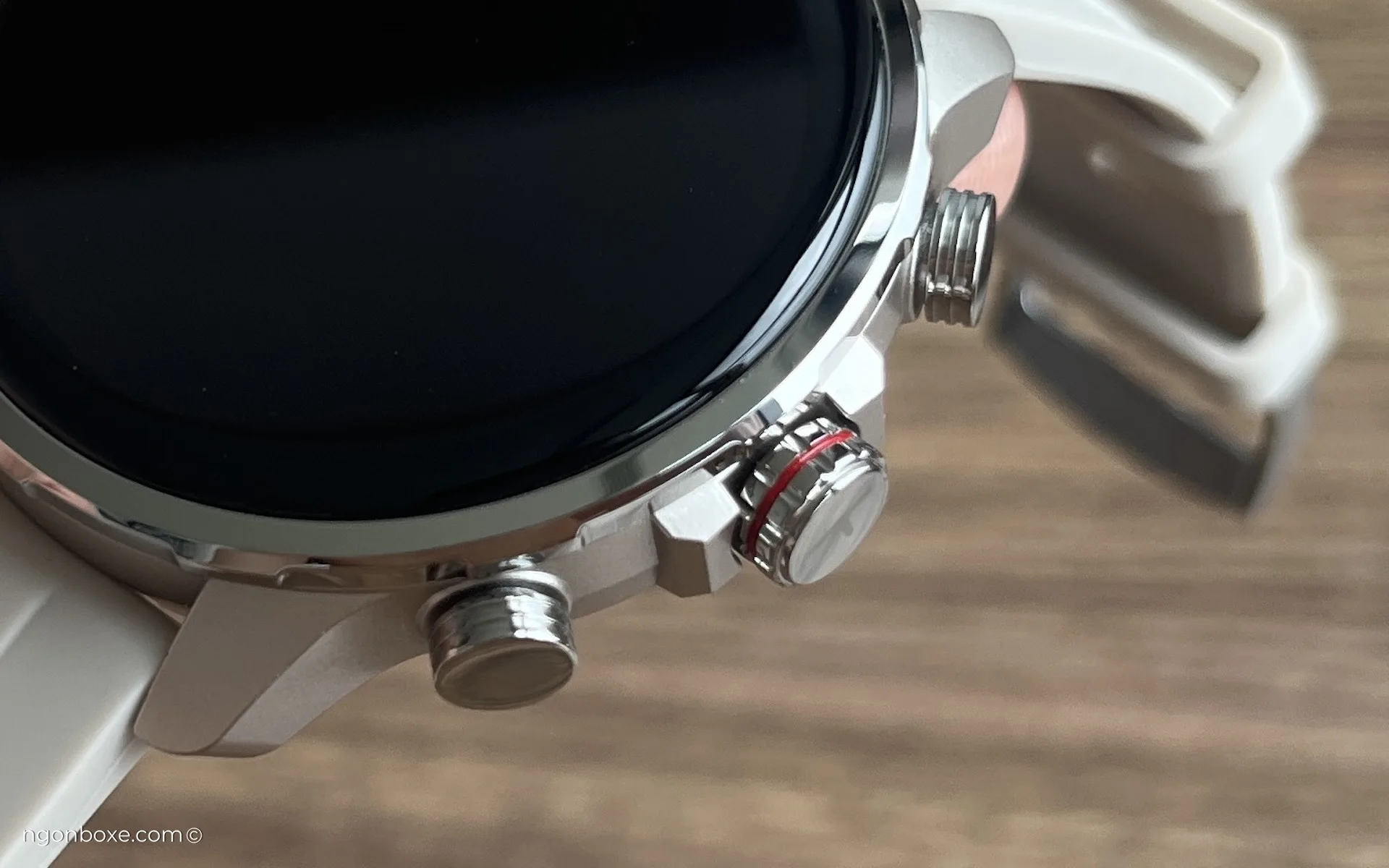 Phía dưới núm xoay có một lỗ, có lẽ là lỗ cho microphone, được đặt ở một vị trí cũng khá kín đáo, sẽ không nhìn thấy lúc đeo trên tay.