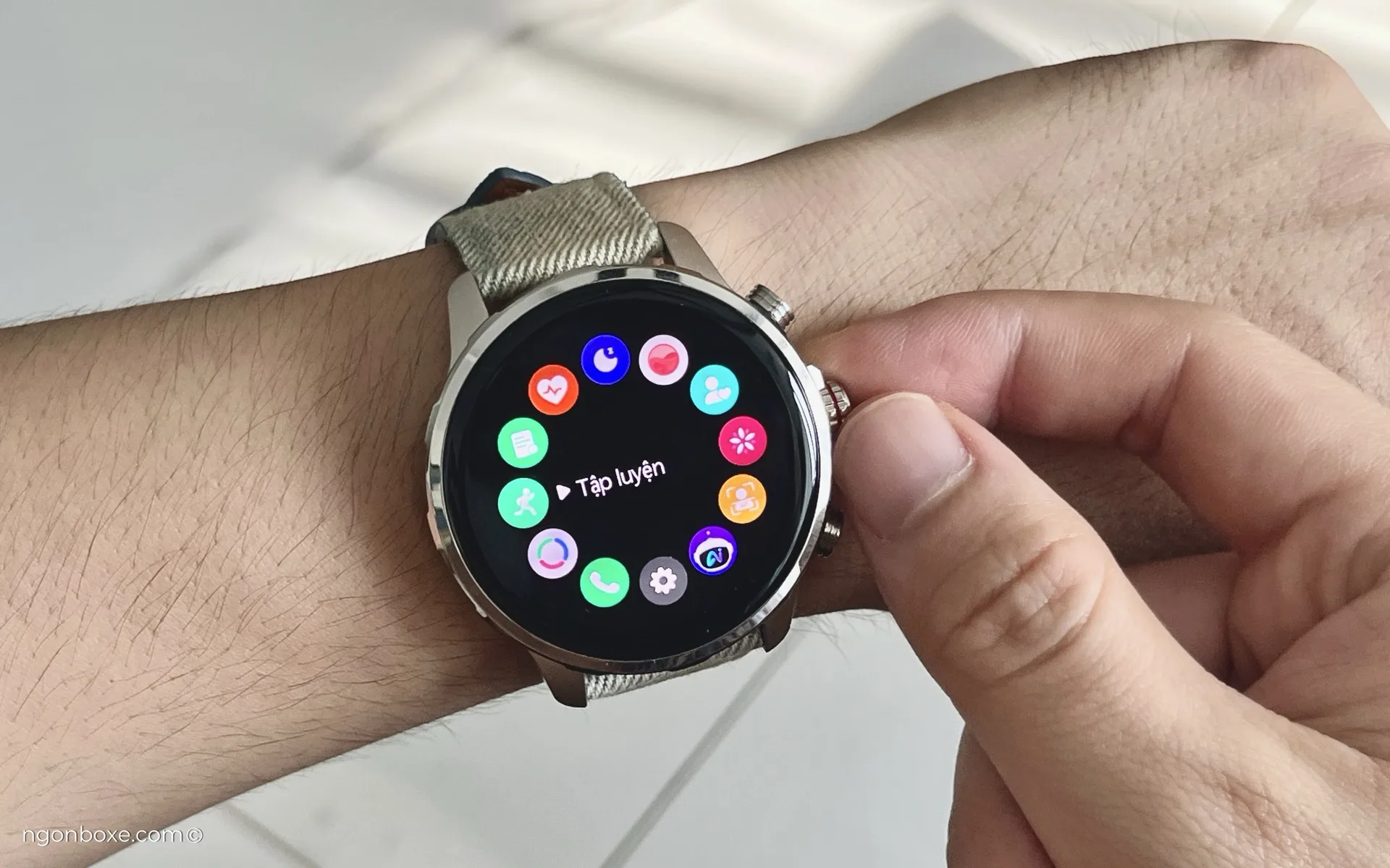 Nút dưới | Chế độ thể thao (hoặc tùy chỉnh trong app) Bật màn hình | Công cụ hỗ trợ giọng nói | Gọi SOS |