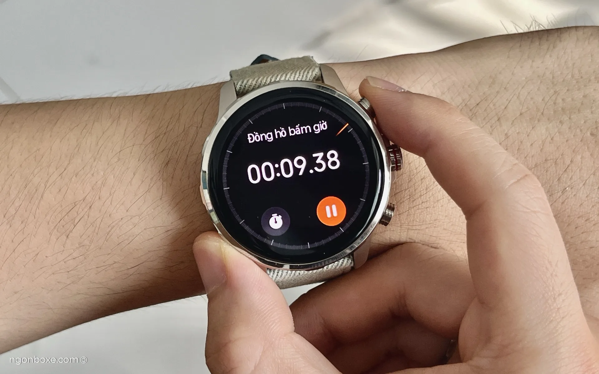 Ngoài ra, khi nhấn đúp nút cứng bên dưới, đồng hồ sẽ mở chế độ trợ lý giọng nói, thực tế là sẽ gọi trợ lý trên điện thoại, với iPhone là Siri, và bạn có thể ra lệnh giọng nói thông qua microphone trên đồng hồ để cho điện thoại thực hiện các thao tác mong muốn.
