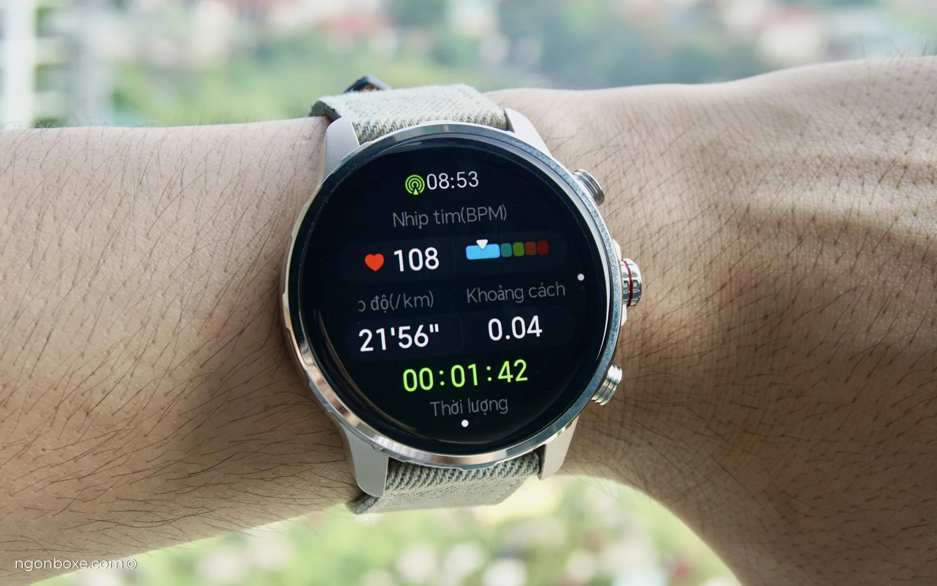 Thời gian để đồng hồ bắt được tín hiệu GPS là khoảng 10-15 giây vào những hôm đẹp trời, không có quá nhiều mây. Giao diện khi tập luyện cũng khá đơn giản nhưng có thể hiển thị hầu hết các thông số cần thiết như nhịp tim, tốc độ pace, quãng đường và thời gian tập luyện.
