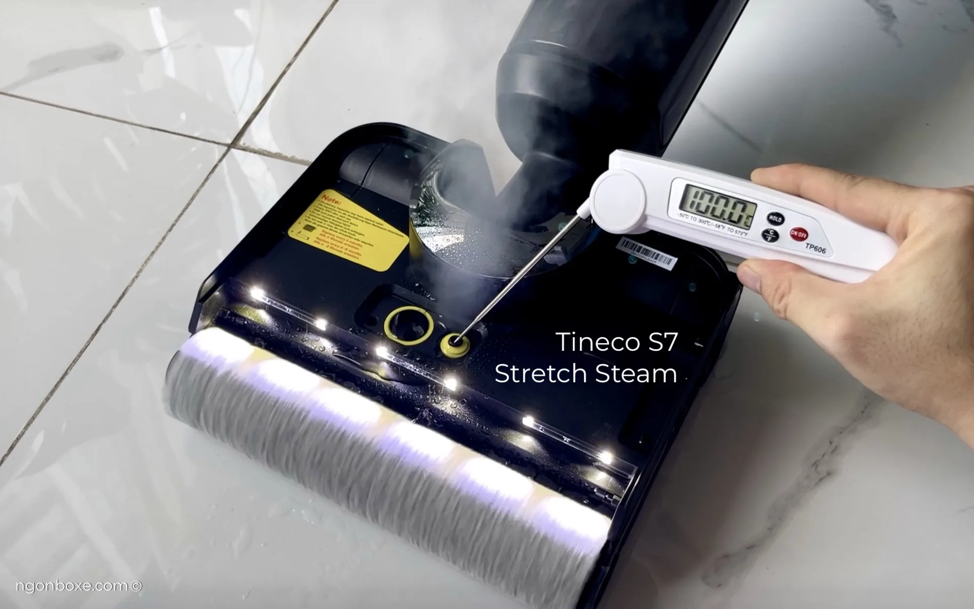 Tineco S7 Stretch Steam có khả năng giặt giẻ bằng nước nóng. Tuy nhiên, để giải thích sâu hơn về nguyên lý, bản chất máy sẽ không trực tiếp đun nóng nước để giặt giẻ, mà sẽ sử dụng nhiệt lượng từ trạm sạc, thổi một luồng khí nóng lên, giúp làm nóng cả nước và con lăn trong quá trình giặt, đem lại hiệu quả giặt nước nóng.