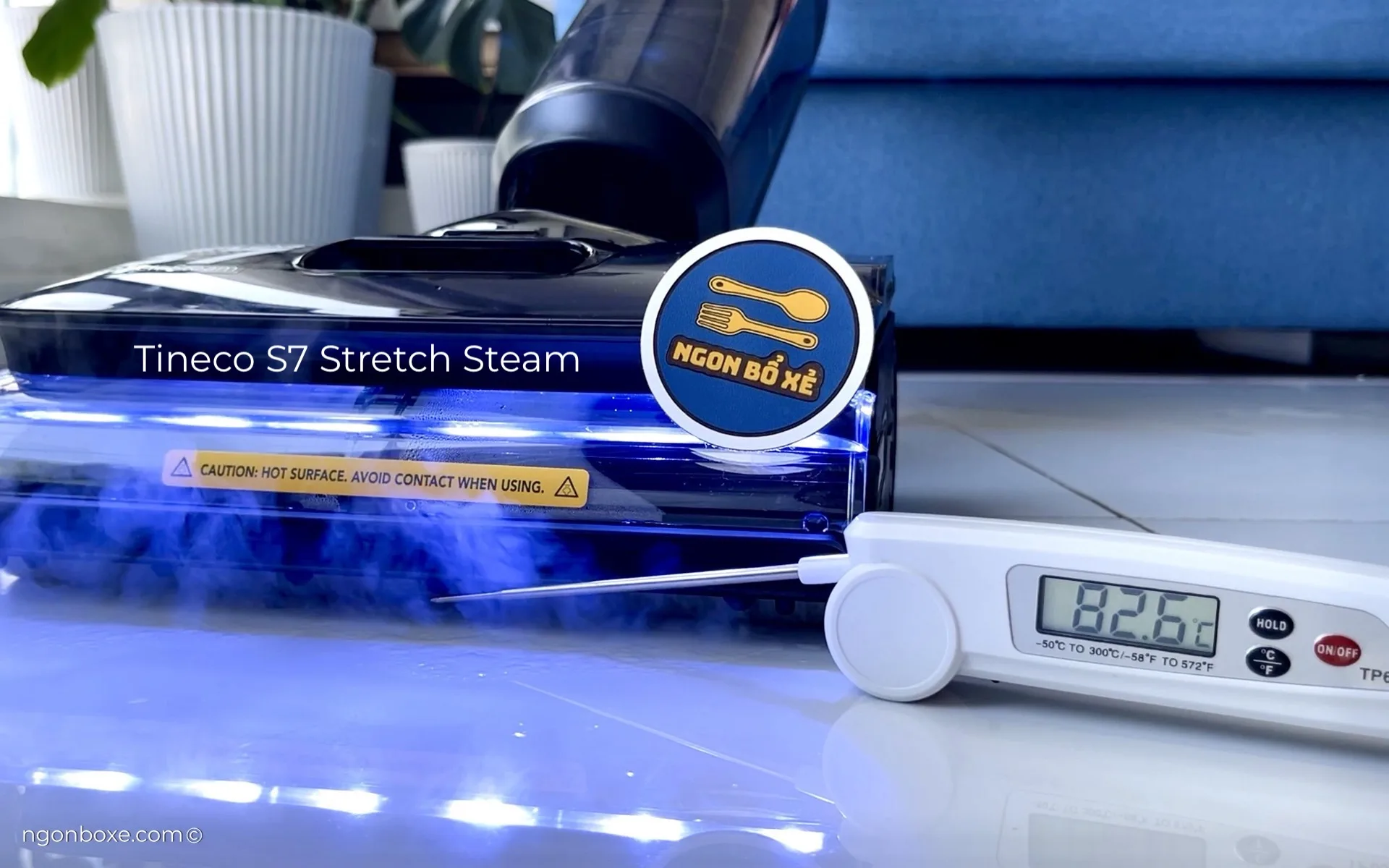 Với Tineco S7 Stretch Steam, mình đo được nhiệt độ hơi nước ở vòi phun là trên 80 độ, cụ thể có những lúc lên đến gần 83 độ. Mình thực hiện đo đạc trong phòng điều hòa đang có nhiệt độ khoảng 25 độ.