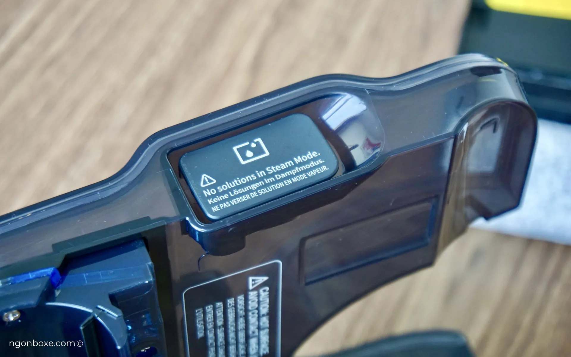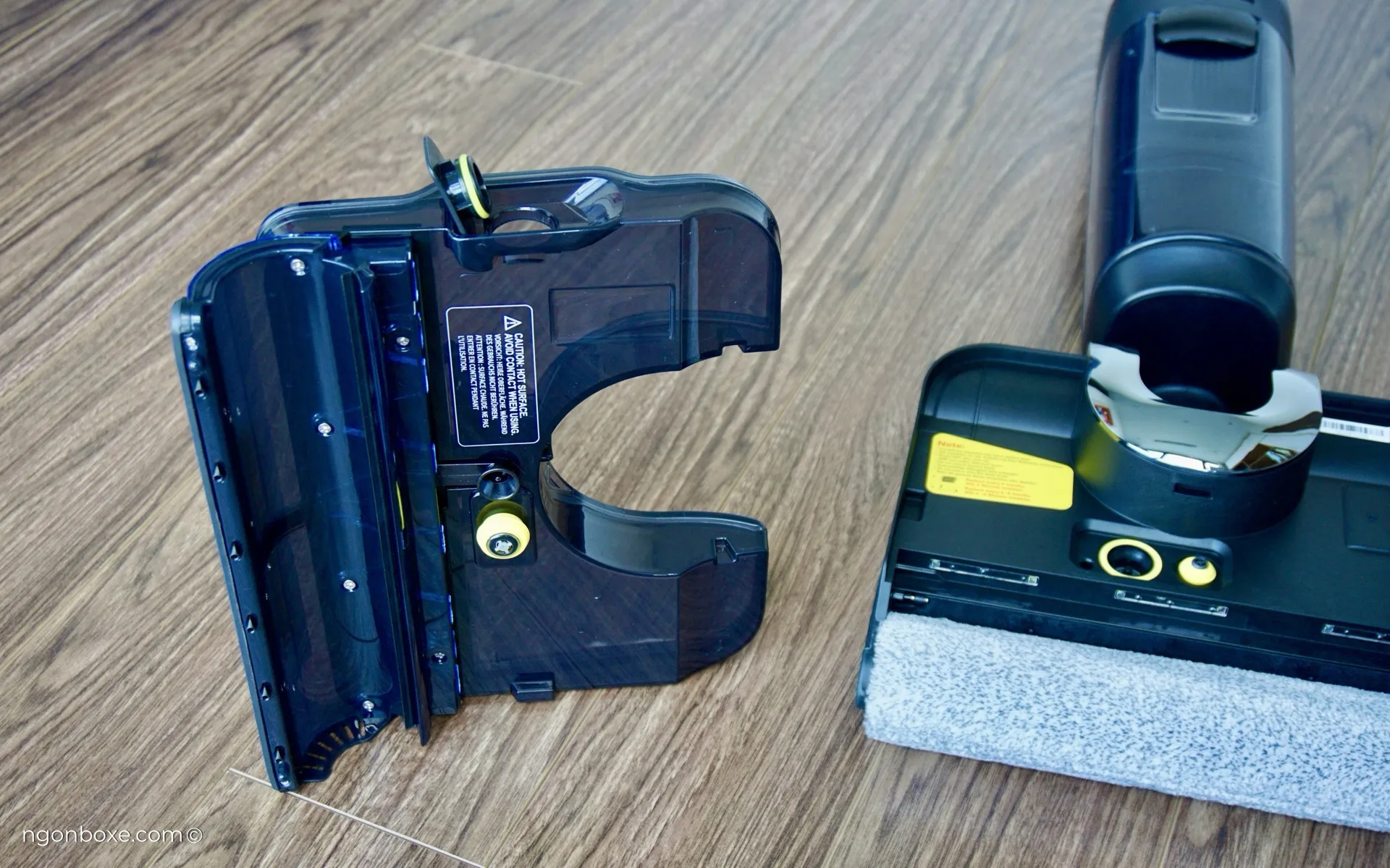 Bình để nước sạch của Tineco S7 Stretch Steam được đặt ở ngay phía trên con lăn, thiết kế này thông minh, vừa tiện cấp nước cho con lăn, vừa phân bổ trọng lượng của máy xuống bộ phận này, và đây cũng là phần nắp trên để phân phối hơi nước ra phía trước con lăn.