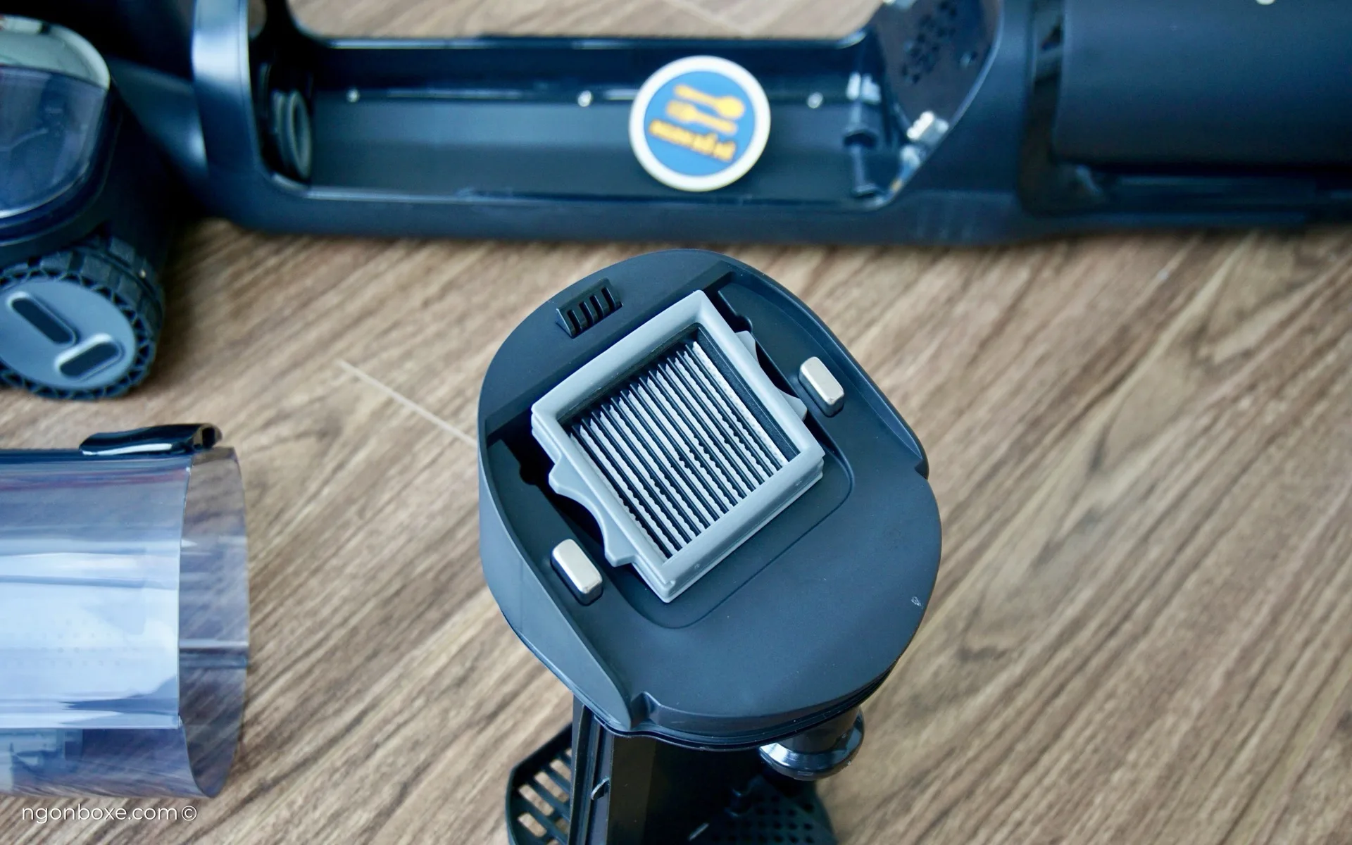 Phía trên cùng của nắp bình chứa nước bẩn là một màng lọc khô, để lọc sạch không khí trước khi đi vào khu vực động cơ. Màng lọc này có thể rửa được với nước.