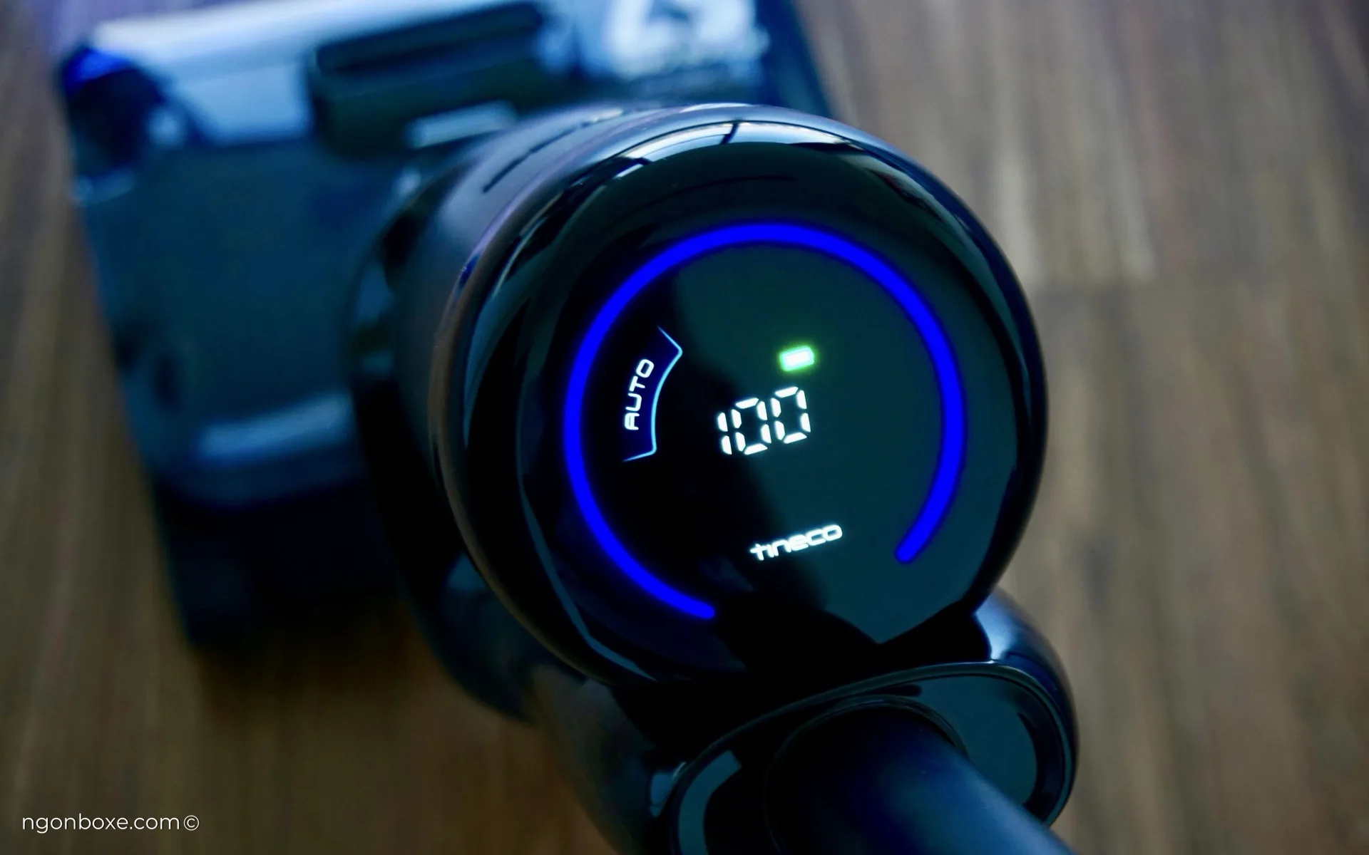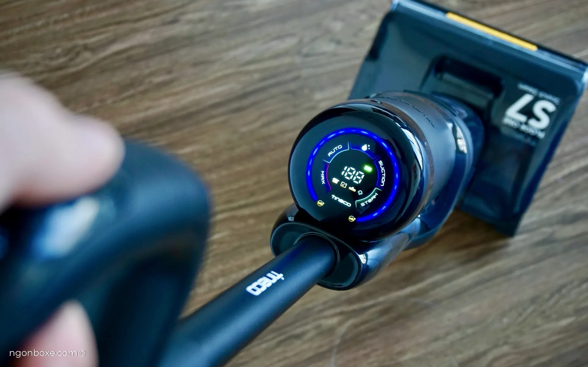 Tinenco S7 Stretch Steam vẫn được trang bị một màn hình hiển thị với đầy đủ các thông tin trực quan như chế độ hoạt động, thời lượng pin, các cảnh bảo và vòng hiển thị mức độ sạch của sàn nhà.
