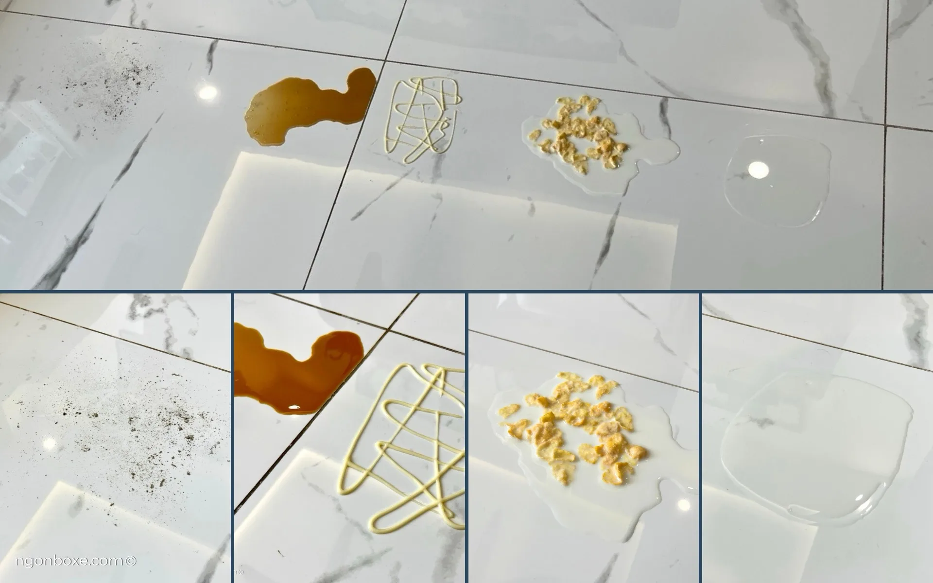Có thể thấy, mọi vết bẩn đều đã được làm sạch một cách dễ dàng. Chỉ có duy nhất vết bẩn dầu ăn, tuy nhìn từ góc độ này cũng đã sạch tương đối, nhưng thực tế khi đổi một góc nhìn khác, sẽ thấy vẫn còn nhiều vệt dầu ăn dính ở trên sàn. Điều này cũng khá dễ hiểu vì đây là loại vết bẩn rất khó làm sạch.